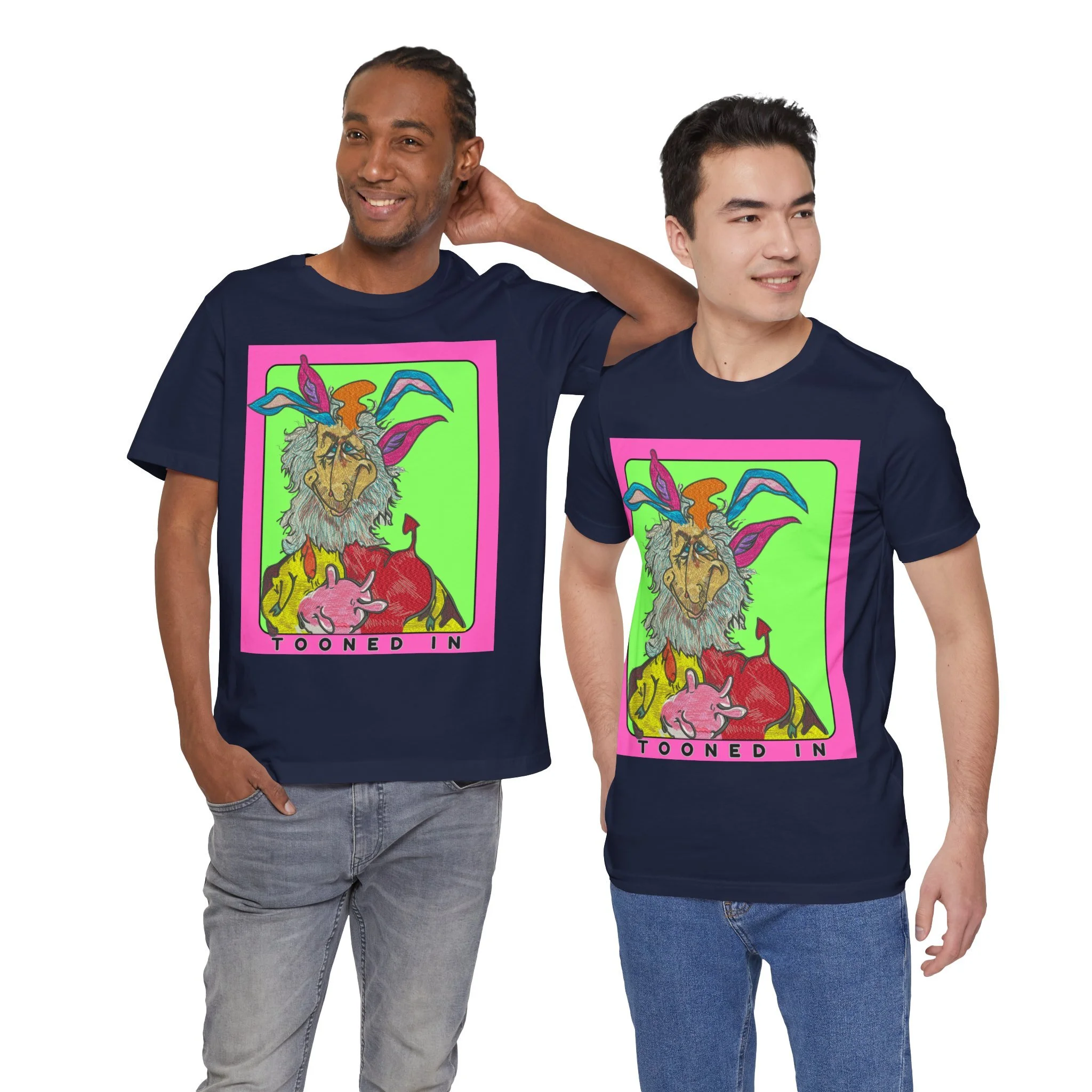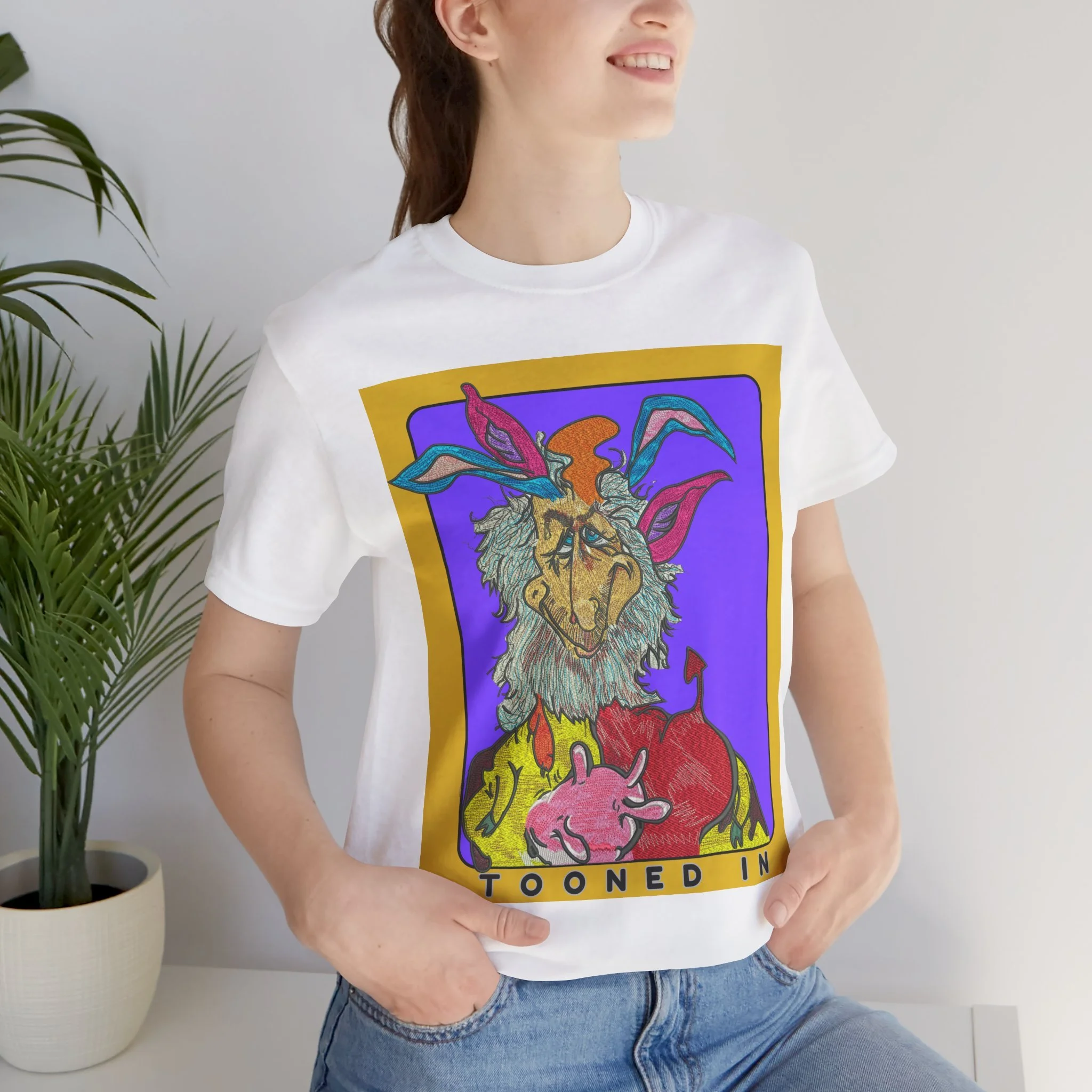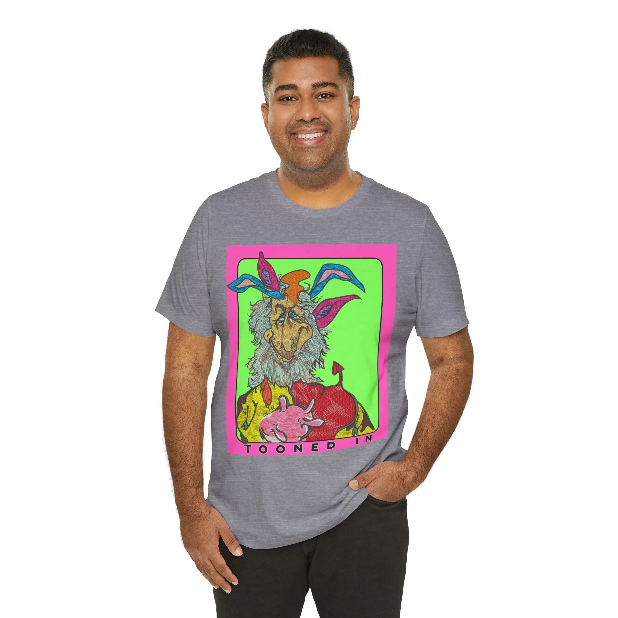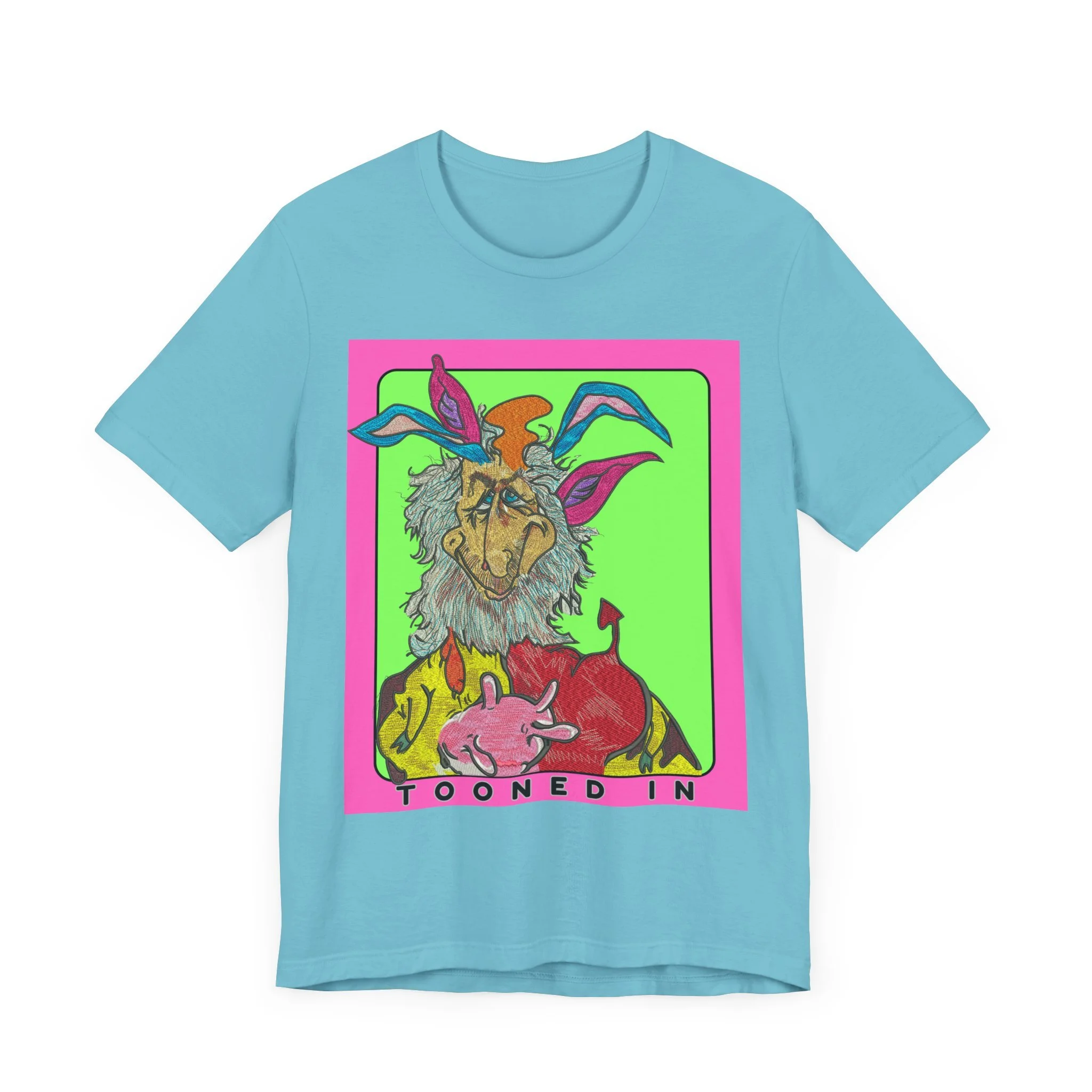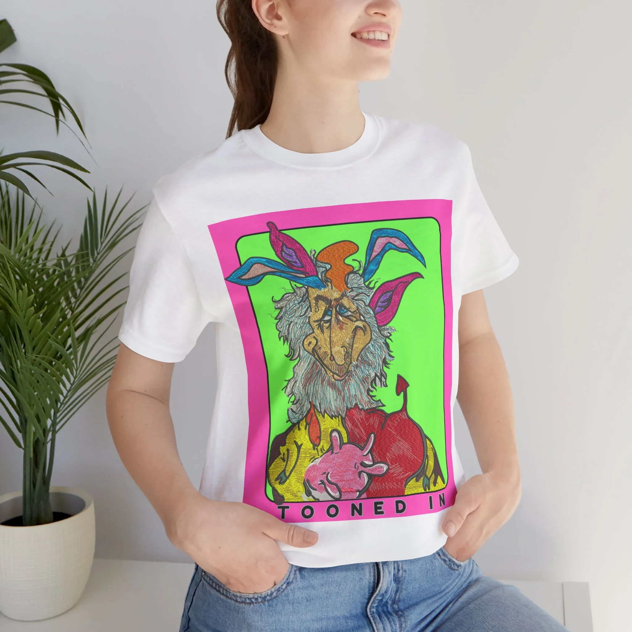 This design is available below on a T-shirt, Hoodie, Tank Top, or Mug. Two different color presentations, with additional variations captioned “TOONED IN”.