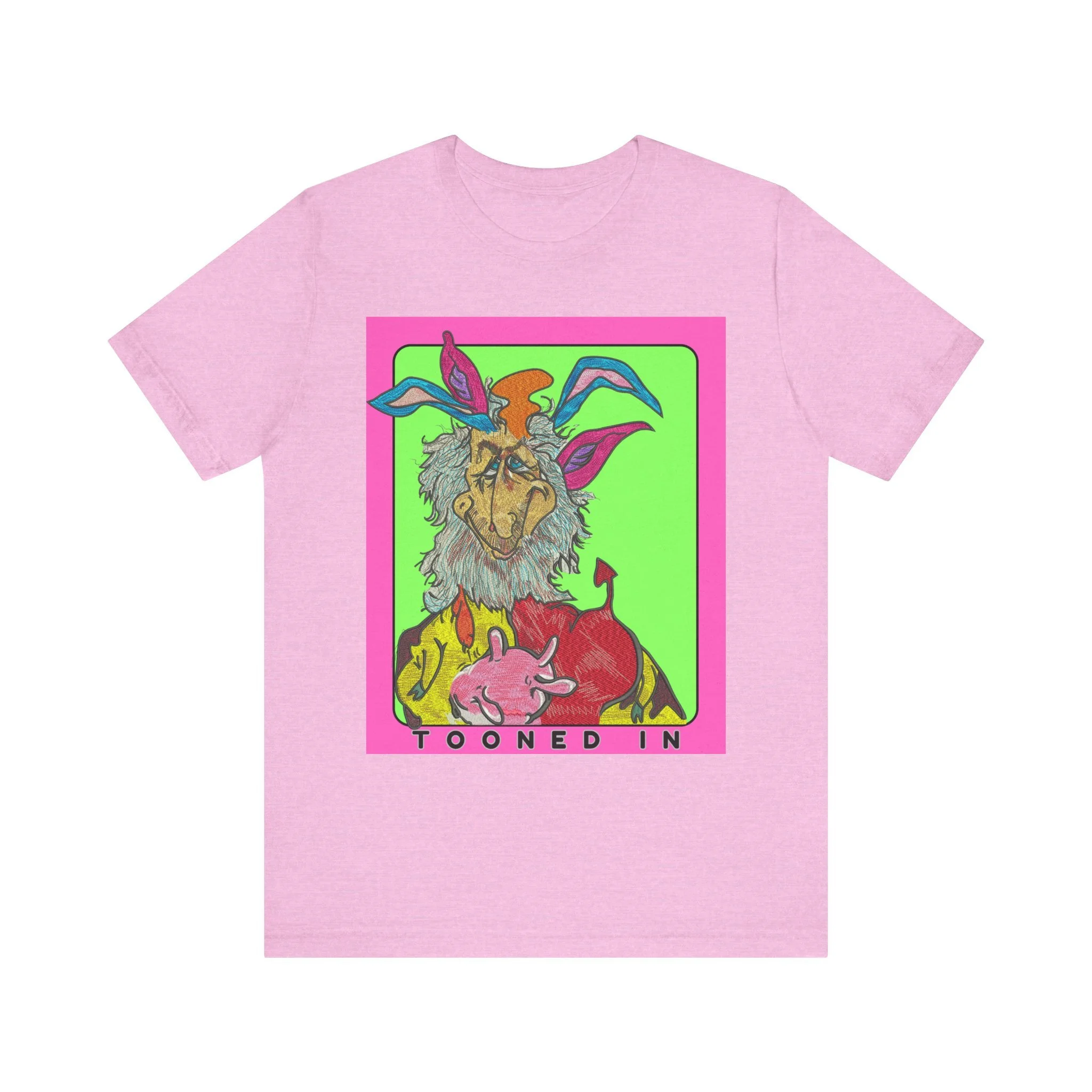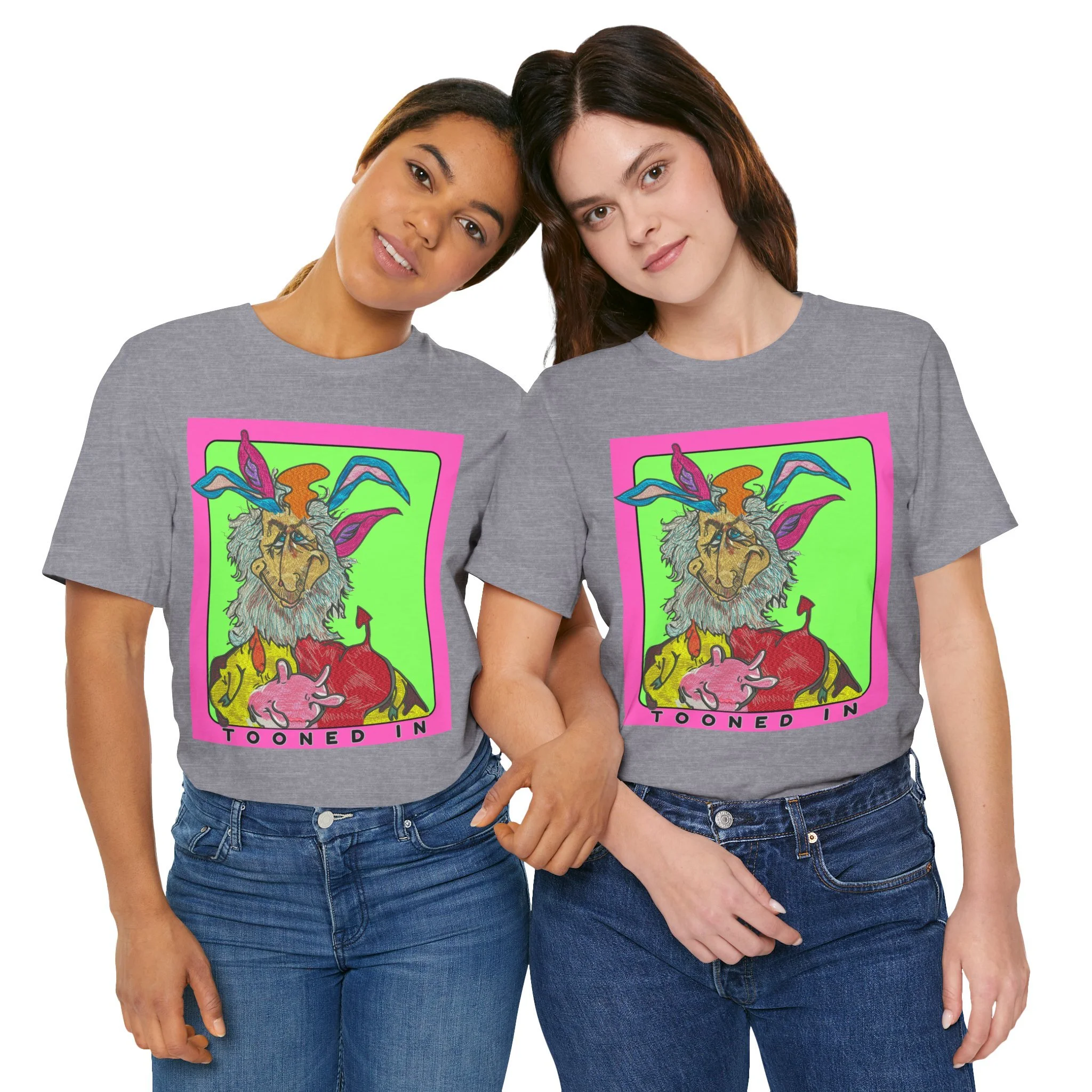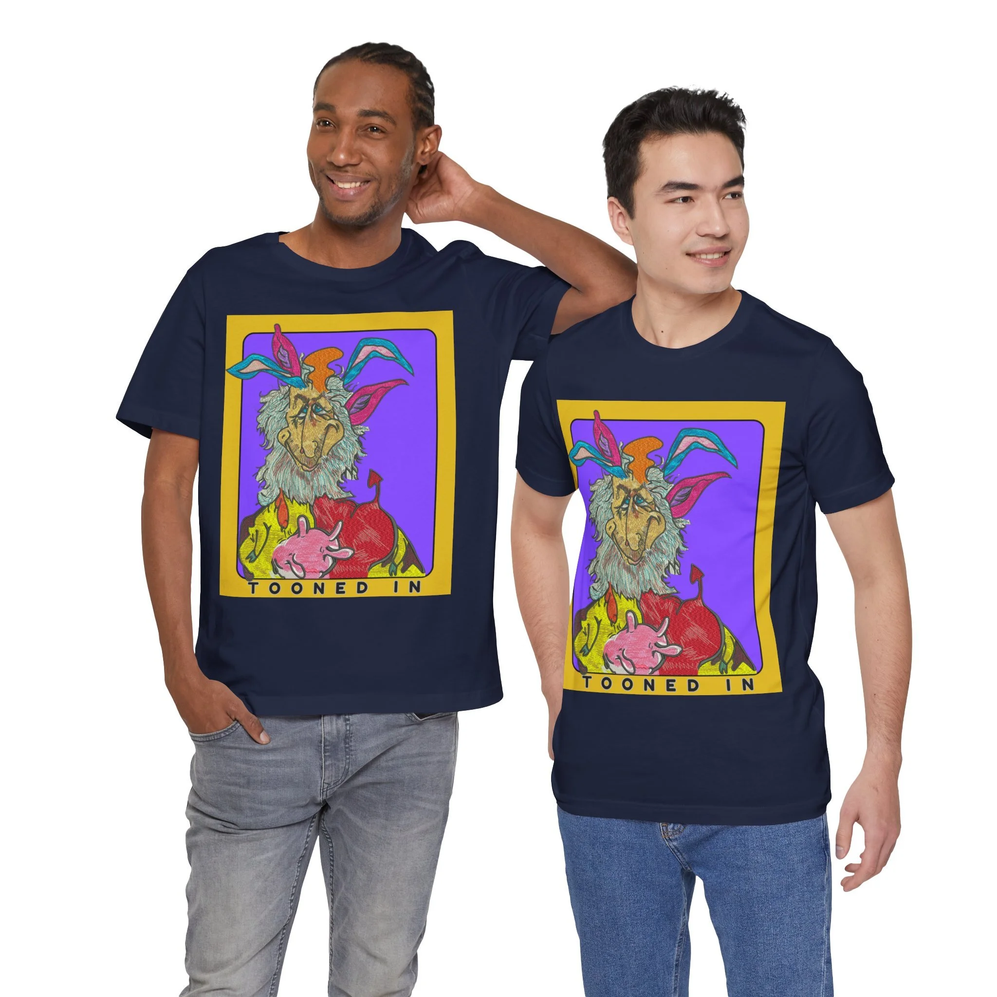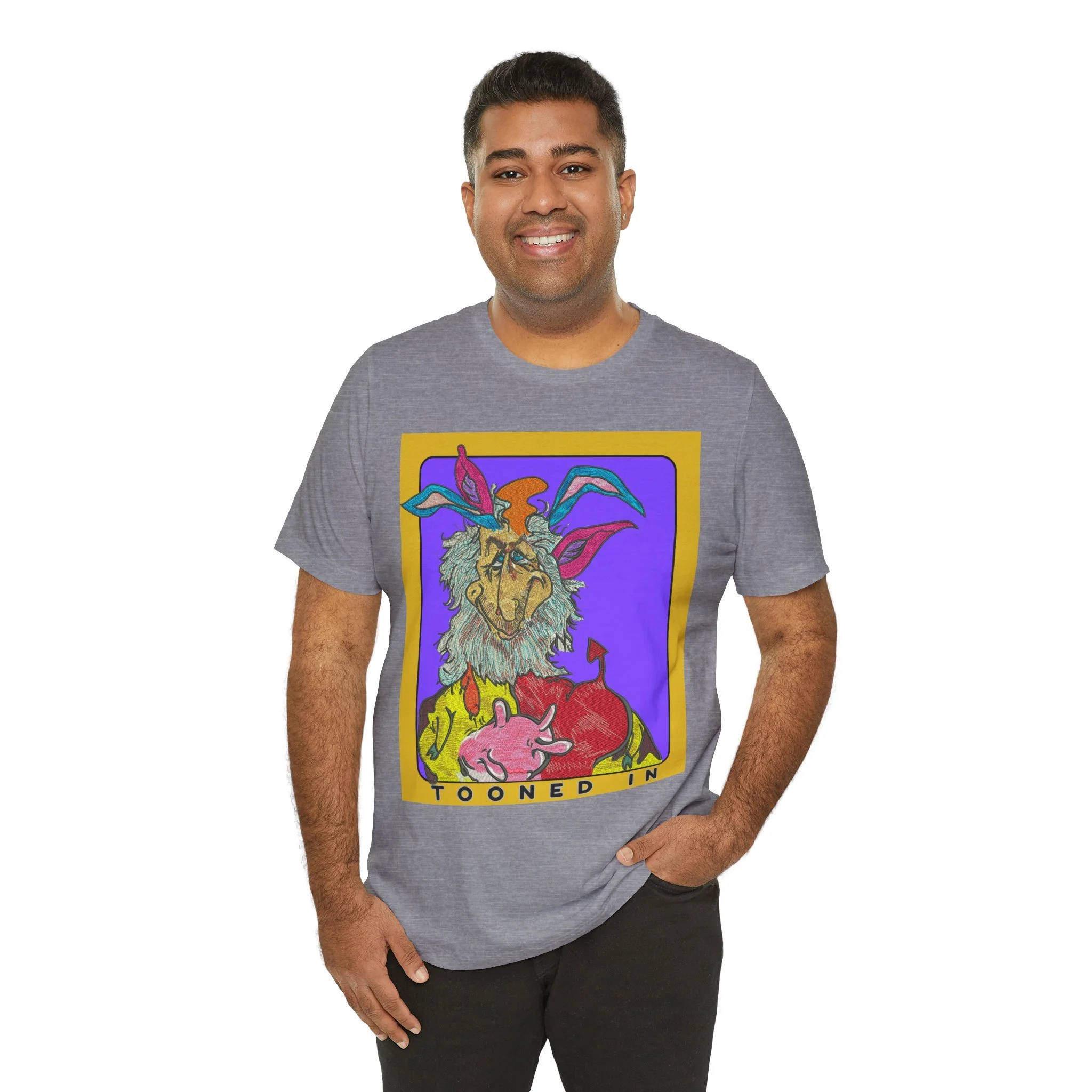 This design is available below on a T-shirt, Hoodie, Tank Top, or Mug. Two different color presentations, with additional variations captioned “TOONED IN”.