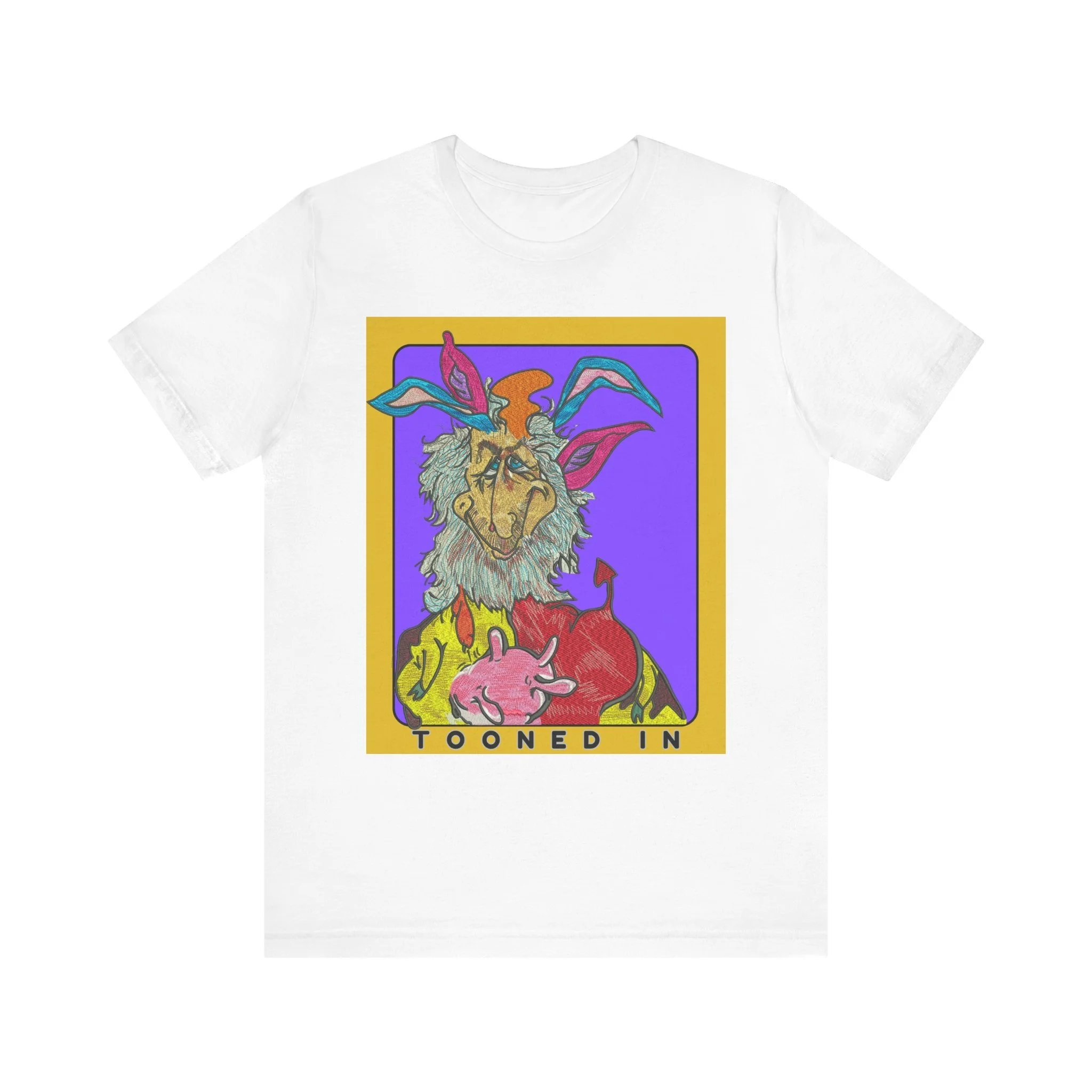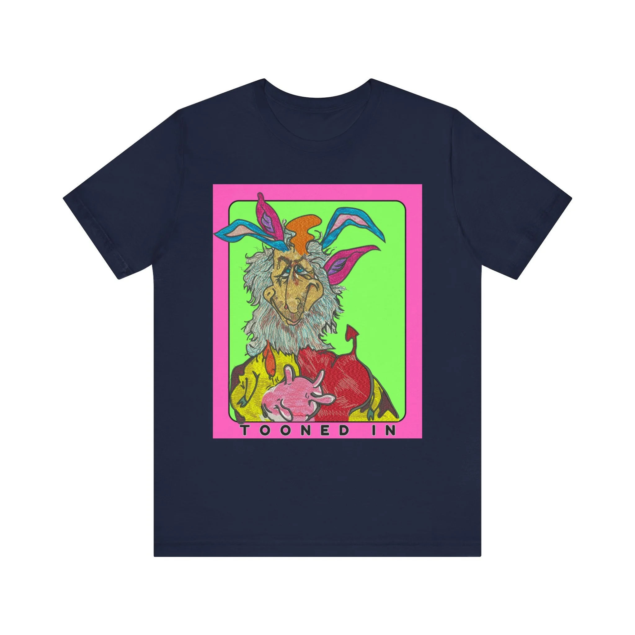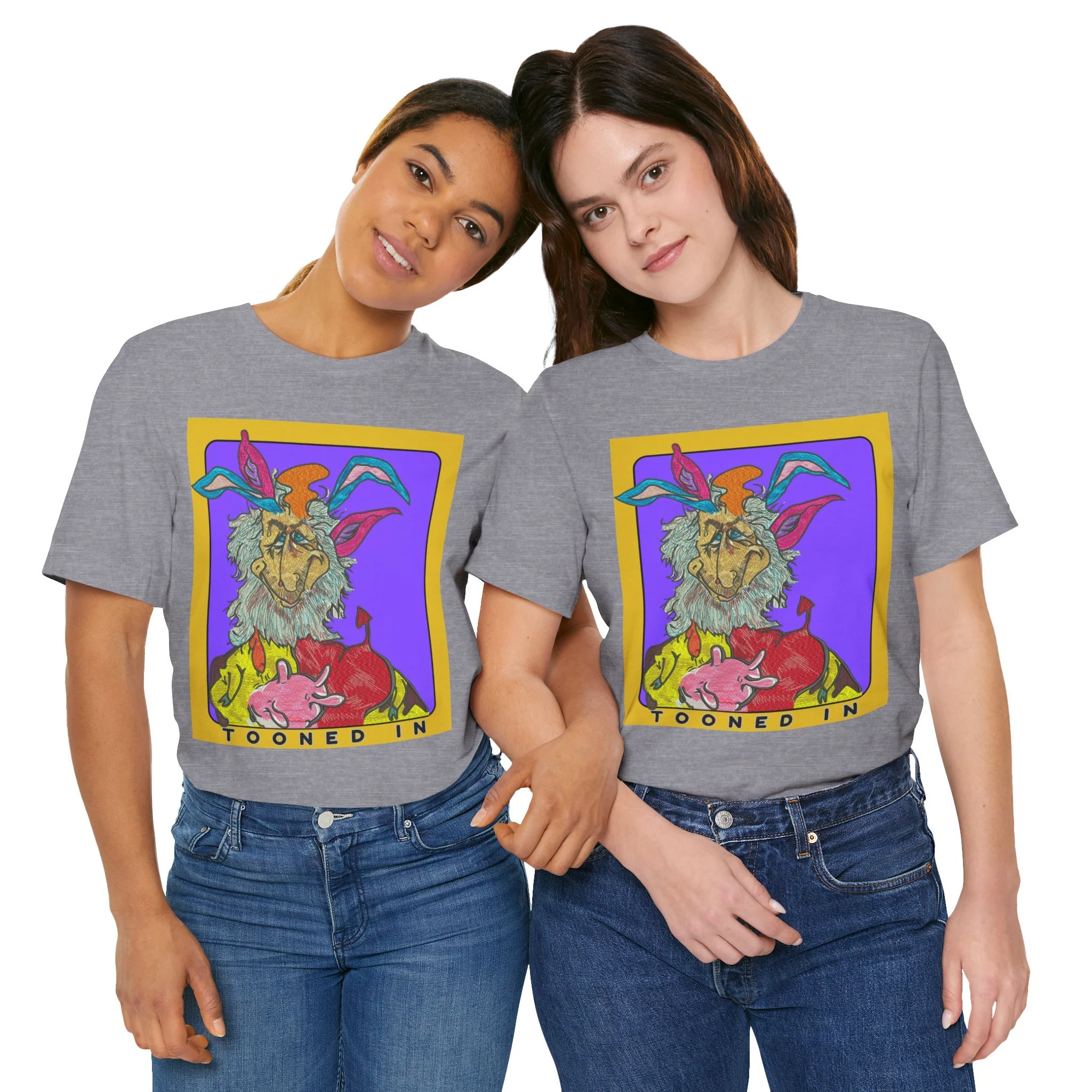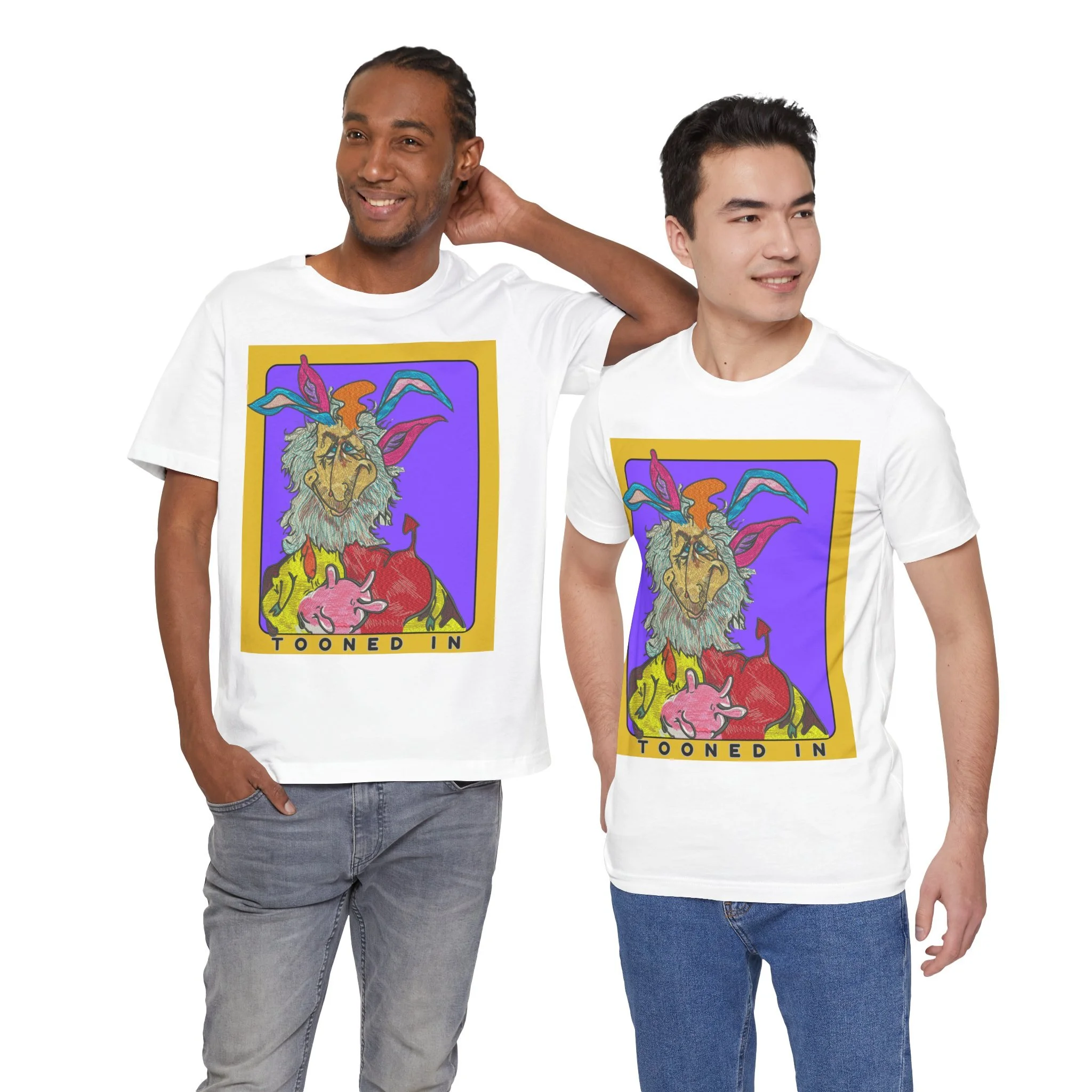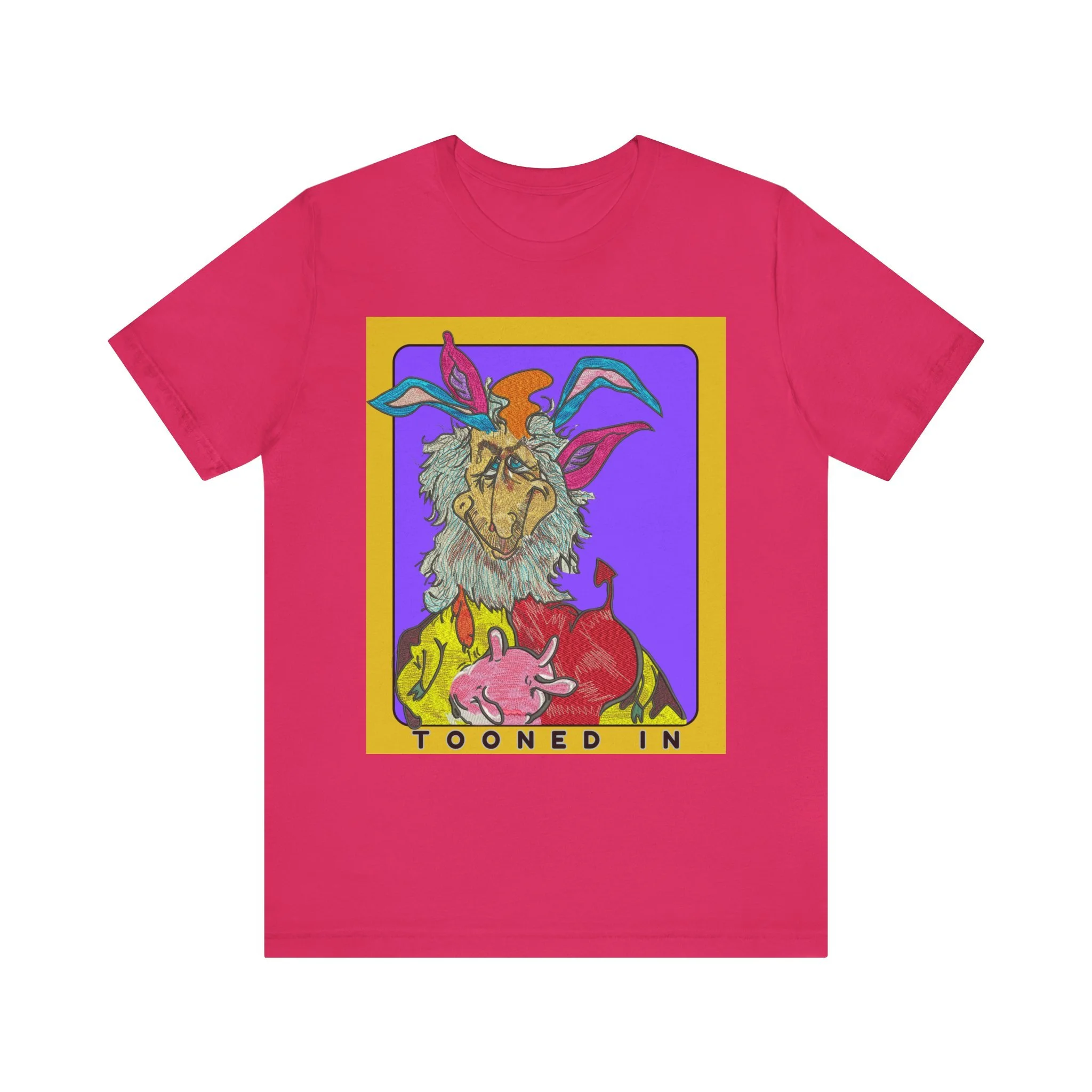 This design is available below on a T-shirt, Hoodie, Tank Top, or Mug. Two different color presentations, with additional variations captioned “TOONED IN”.
